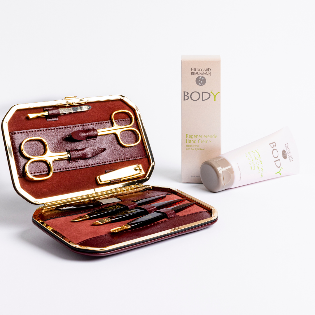 Enthält 1 Nagelschere, 1 Hautschere, 1 Pinzette, 1 Nagelknipser, 3 Manikürinstrumente und 1 Saphir-Nagelfeile, vergoldet. Manikürscheren und Pinzette hergestellt in Solingen Deutschland. Rahmenetui aus weinrotem Spaltleder, aufklappbar.